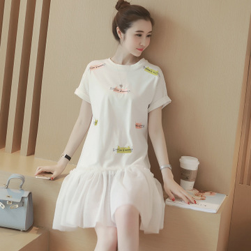 2016夏新款大碼顯瘦襯衫褶皺貓咪刺繡網紗拼接連衣裙 /