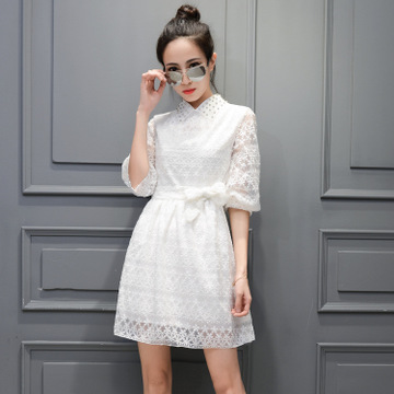 實拍夏季新款2016蕾絲亮片修身釘珠圓領刺繡女連衣裙(腰帶) /