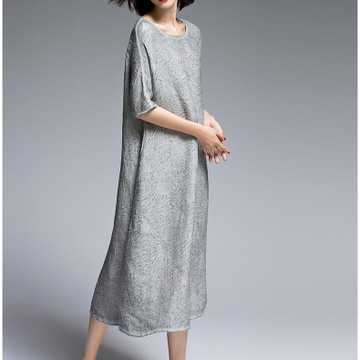 白夜2016早春新款素雅文藝暗紋提花做舊炒色寬松落肩絲麻連衣長裙 /