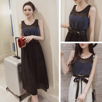 實拍現(xiàn)貨2016春夏新款寬松無袖松緊腰拼接網(wǎng)紗中長款連衣裙 /