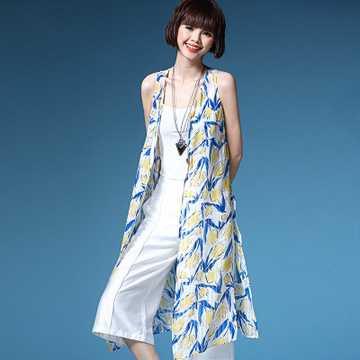 雪紡開衫馬夾2016新款韓版修身顯瘦中長款印花馬甲女薄款防曬外套 /