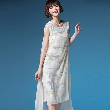 2016夏季薄款休閑印花雪紡女裙中長款寬松大碼防曬圓領套頭連衣裙 /