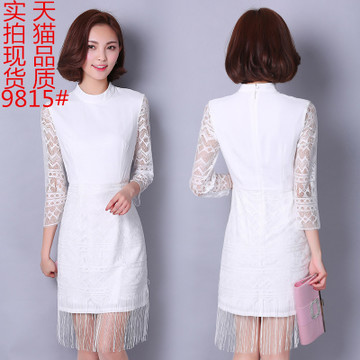 實拍現貨2016春季新款裙子蕾絲拼接包臀裙女七分袖流蘇連衣 /