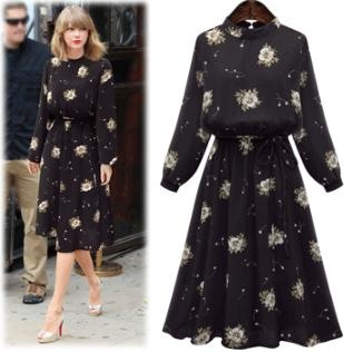 歐洲站春季新款碎花復古顯瘦長袖打底雪紡連衣裙 /