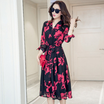 實拍2016夏季歐美新品印花真絲碎花修身顯瘦時尚中長款連衣裙 /