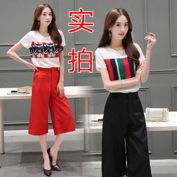 闊腿褲套裝女夏2016歐美時尚休閑雪紡短袖七分褲裙兩 /