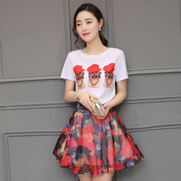 夏季短袖印花女裝連衣裙韓版修身花色短裙兩件套裝裙女潮 /