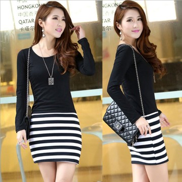 一件代發批發秋裝連衣裙長袖修身條紋拼接顯瘦氣質包臀淑女 /