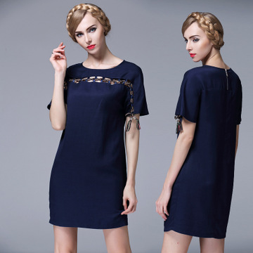 2016女裝春款連衣裙短袖歐美真絲麻彩色手編帶純色圓領A子裙2042 /