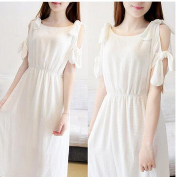 2016夏季大碼甜美海邊露肩蝴蝶結連衣裙白色雪紡仙女長裙 /