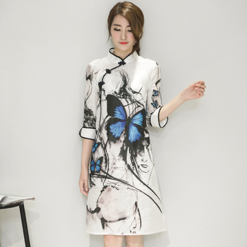 2016春夏裝新款韓版復古女裝印花直筒盤扣旗袍 /