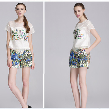 2016歐美時尚優質大碼女裝鏤空網紗圓領短袖T恤+印花短款兩件套裝 /
