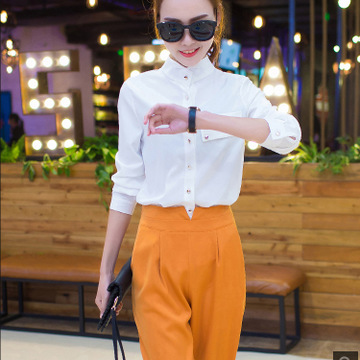 韓版時尚新款女裝OL氣質立領單排扣長袖襯衫+高腰顯瘦長褲兩件套 /