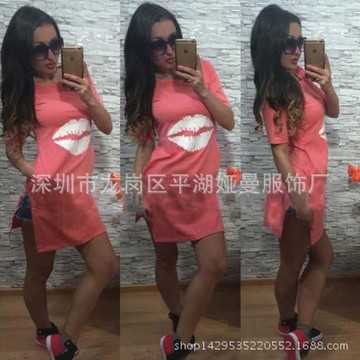 亞馬遜ebay熱賣新款2016歐美風嘴唇印膠中長款短袖T恤開叉連衣裙 /