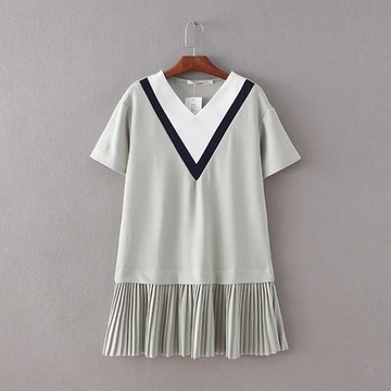 外貿批發(fā)太陽的后裔宋慧喬明星同款V領拼色短袖打底百褶連衣裙 /