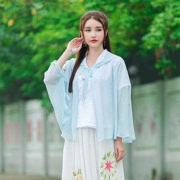 2016手繪漢服元素斗蓬披風夏季 薄款防曬連帽系帶中式開衫外套女 /