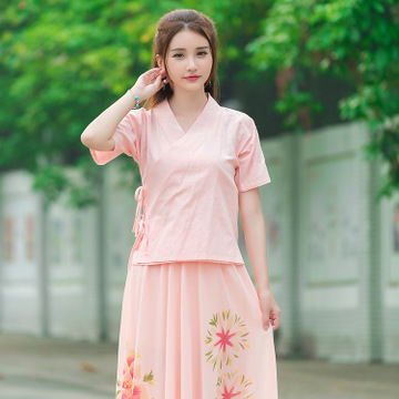 中式交領棉麻系帶改良古裝漢服女 2016夏季純色短袖開衫上衣代發 /