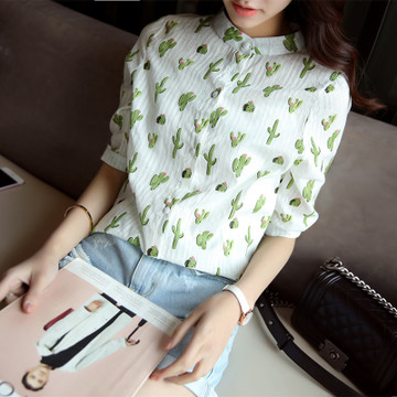 2016春夏新款仙人掌圖案可愛學院風印花薄款中袖寬松純棉襯衫女 /