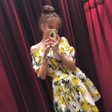 古力娜扎明星同款一字領松緊腰短袖檸檬圖案印花連衣裙女 /