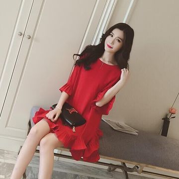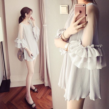 2016春裝新款韓版百褶雪紡連衣裙七分喇叭袖寬松網紗拼接短 /