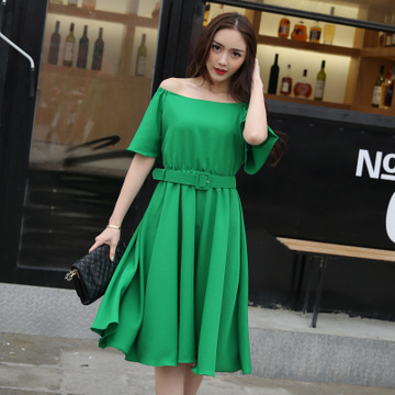 2016夏季新款一字領(lǐng)連衣裙女時尚露肩中長款大擺裙修身顯瘦贈腰帶 /