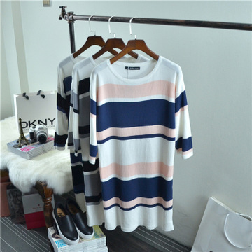 橫條紋彩條拼接撞色寬松款五分袖中長針織衫 一件代發(fā) /