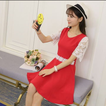 2016夏季新款韓版女裝大紅色修身顯瘦短袖連衣裙蕾絲大擺裙 /