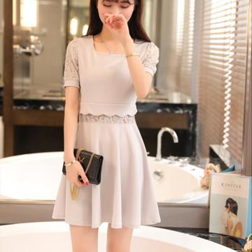 2016夏裝新款韓版蕾絲拼接波浪邊修身連衣裙短袖收腰女裙子 /