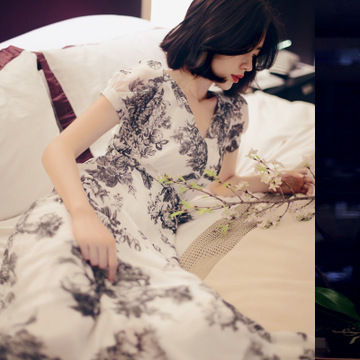 2016夏裝新款韓牌名媛氣質修身印花雪紡連衣裙開叉飄逸大擺長裙 /