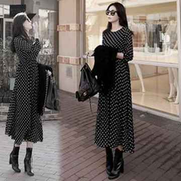 2016春季雪紡連衣裙長袖韓版中長款波點顯瘦打底裙波西米亞長裙 /