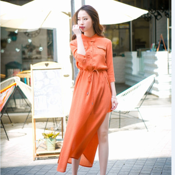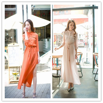 2016春夏新款連衣裙韓版優雅時尚性感高開叉修身小立領飄逸長裙女 /