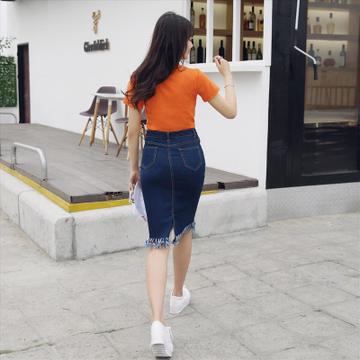 2016實拍夏季甜美街頭套裝美臀流蘇開叉牛仔裙+清爽棉T兩件套 /
