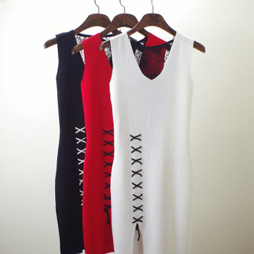 2016夏季新款純色修身曲珠連衣裙蕾絲紗網中長款針織衫套頭連衣裙 /