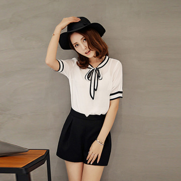 2016夏季新款女裝休閑時(shí)尚兩件套雪紡短袖圓領(lǐng)短褲套裝女 /