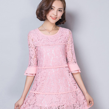 廠家 連衣裙春中長(zhǎng)款修身大碼女裝韓版百搭中袖鏤空蕾絲打底裙子 /