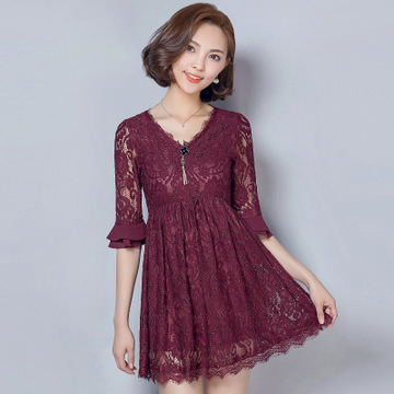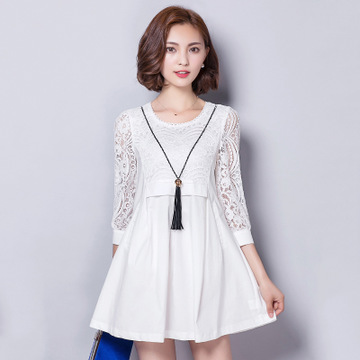 中袖蕾絲連衣裙春季新款韓版修身百搭中長(zhǎng)款大碼打底衫上衣女 /