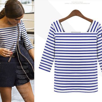 七分袖條紋顯瘦T恤女春裝新款2016大碼寬松一字領純棉打底衫夏季 /