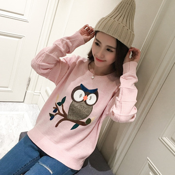 2016秋冬新韓版修身顯瘦刺繡貓頭鷹套頭針織衫毛衣打底針織衫女 /