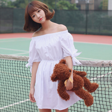 東大門2016夏季新款日系一字領泡泡袖蝴蝶結連衣裙女 /