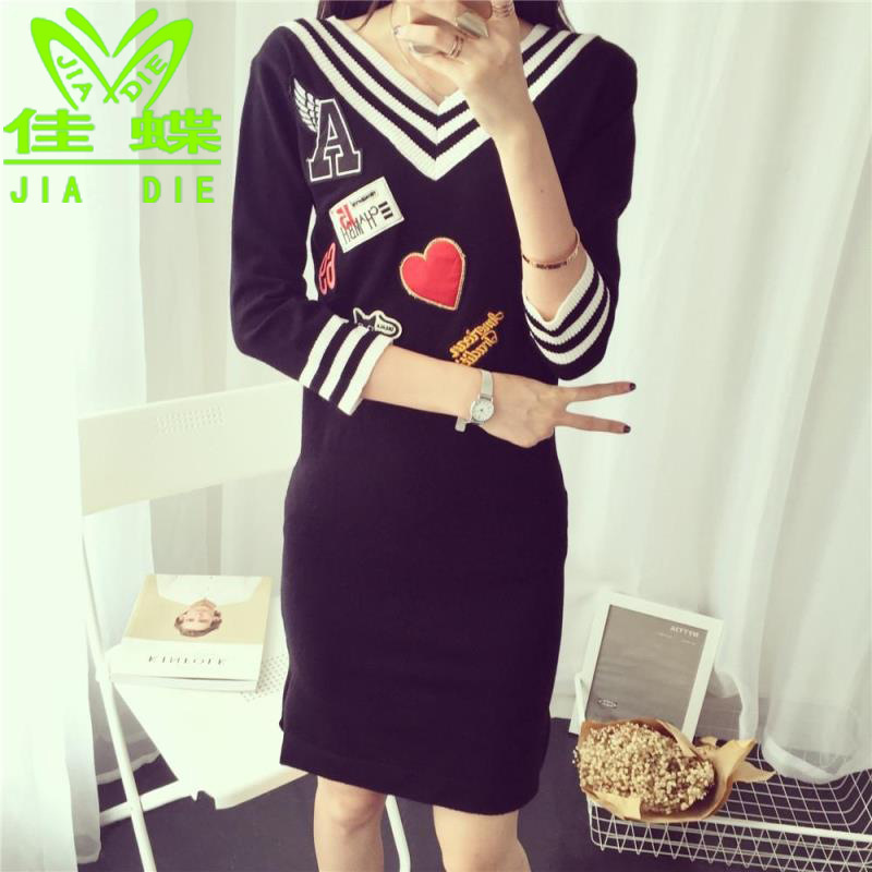 2015秋季新款韓版女裝雙V領中長款條紋套頭針織衫女式毛衣 /