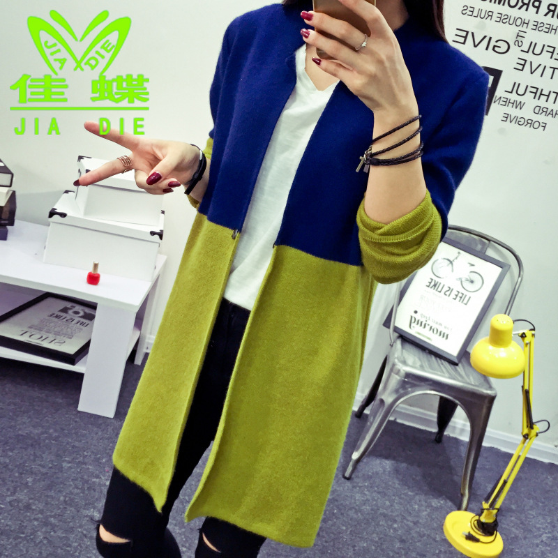 2015秋裝新款韓版中長款女裝拼色毛衣立領寬松針織衫女式開衫 /
