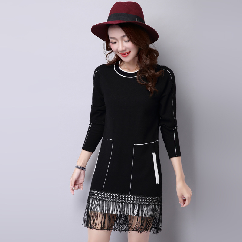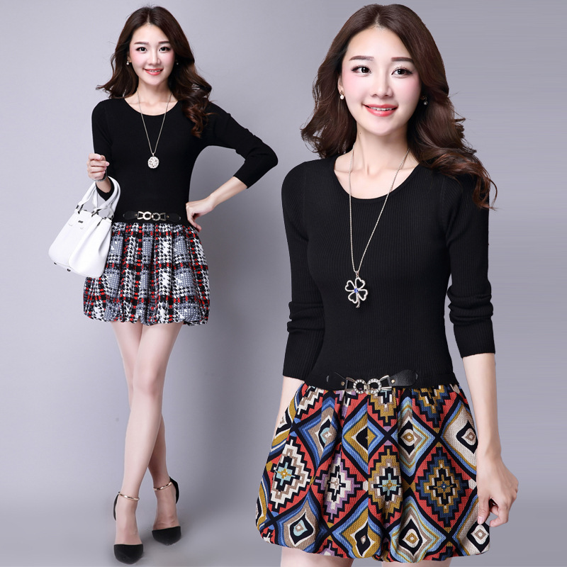 最新款秋裝女 時(shí)尚修身打底針織衫裙 圓領(lǐng)拼接雪紡中長(zhǎng)款毛衣裙 /