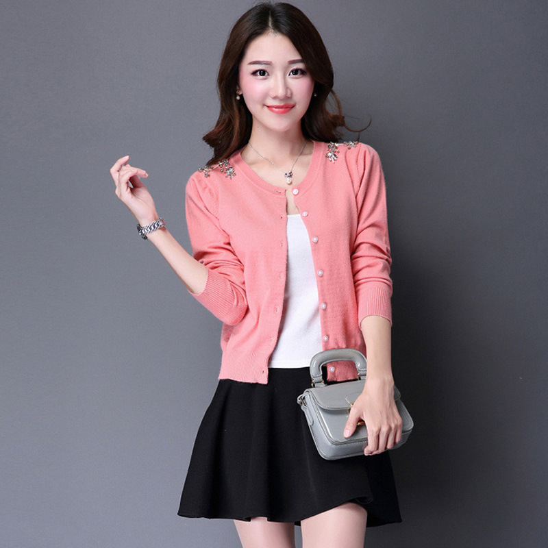 韓版女裝2015秋季新發(fā)針織開(kāi)衫女款手工釘珠寬松圓領(lǐng)針織小外套女 /