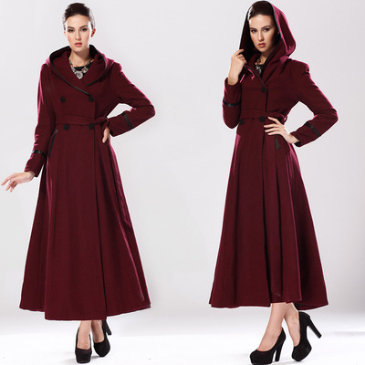 2015新款秋冬歐美長款大碼毛呢大衣外套雙排扣腰帶大衣連帽女裝 /