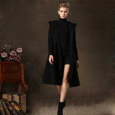2015歐美秋新款毛呢大衣外套收腰氣質(zhì)收腰連帽中長款羊毛呢女大衣 /