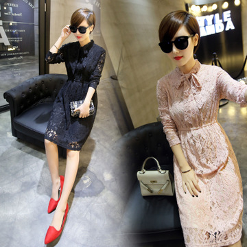 一件代發 2016春夏新款 韓版蕾絲蝴蝶結領結收腰高腰中長款連衣裙 /