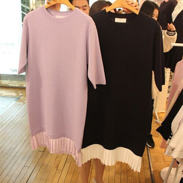 8214#2016春裝新款 韓版拼接下擺百褶裙 短袖圓領修身連衣裙 女 /
