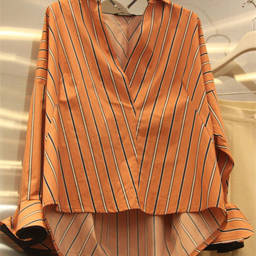 8217#2016春裝新款 韓版條紋V領寬松長袖套頭襯衫 女 /