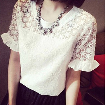 2016蝴蝶結夏季甜美鏤空荷葉邊短袖蕾絲衫女裝白色雪紡短袖上 /