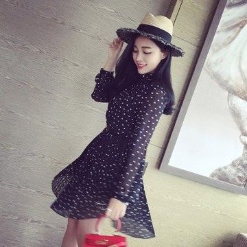2016春季新款歐美復古波點不規則下擺飄逸雪紡連衣裙 /